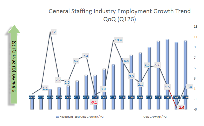 YoY: Overall, the staffing industry grew at 6.1% YoY (Q1 26)
