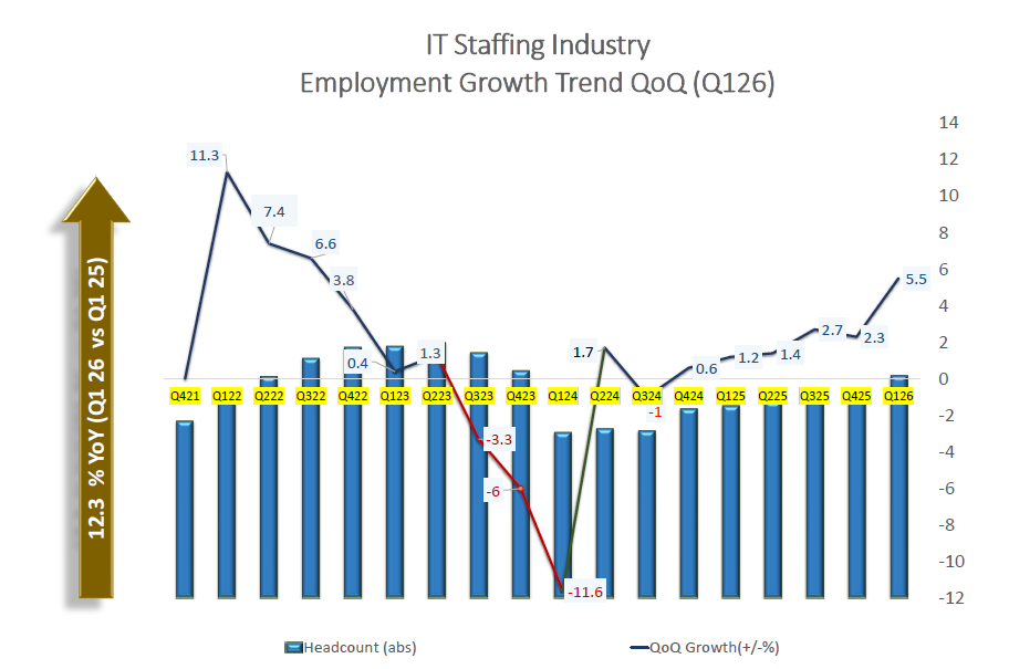 (Q1 vs Q1), whereas the IT staffing industry came out of the red with a