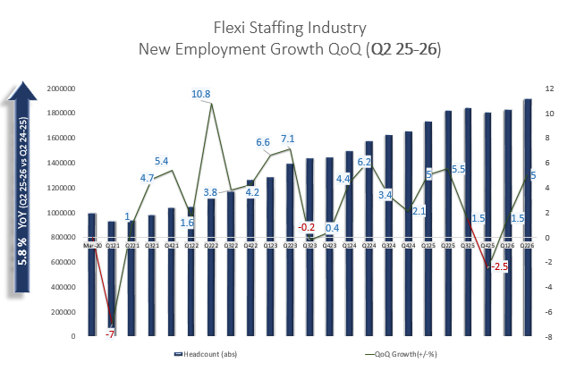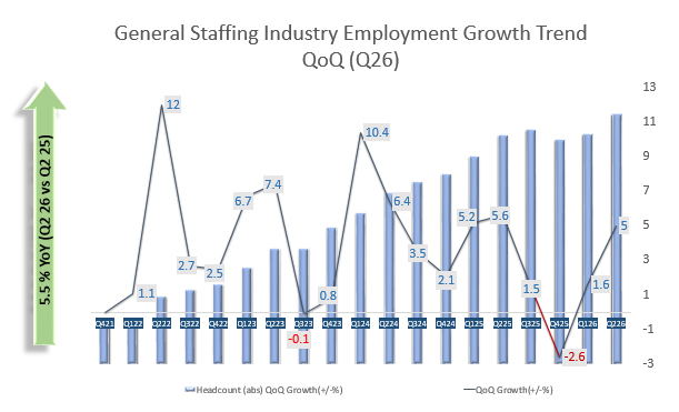 · Overall Staffing Industry grew at 5% QoQ (Q2 26) aided
